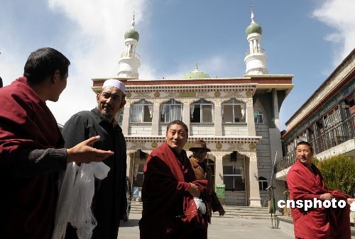 中新社拉薩三月二十二日電(記者 柳俊武) 拉薩大昭寺喇嘛代表繼慰問保護廟宇的值勤武警官兵后,二十二日又前往拉薩市救助站、拉薩清真大寺看望慰問各族受害信眾,并與伊穆斯林信眾共話藏、回民族團結。