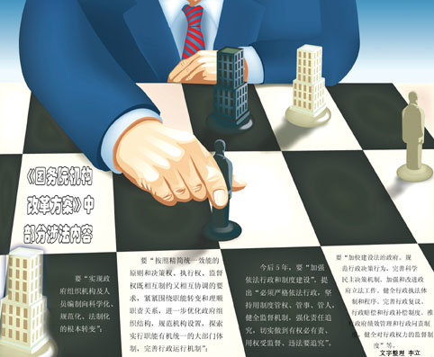 比如,要“實現政府組織機構及人員編制向科學化、規范化、法制化的根本轉變”;要“按照精簡統一效能的原則和決策權、執行權、監督權既相互制約又相互協調的要求,緊緊圍繞職能轉變和理順職責關系,進一步優化政府組織結構,規范機構設置,探索實行職能有機統一的大部門體制,完善行政運行機制”……
