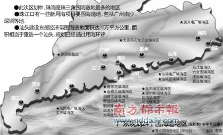 李珠江在昨日的新聞發(fā)布會上表示,新一輪的大發(fā)展,就是要加快建設粵東、粵西、珠三角三個海洋經(jīng)濟帶,大力發(fā)展能源、石化、鋼鐵和造船四個產業(yè)群,推動扶持30個重大項目建設投產。新獲批的《區(qū)劃》劃定了146平方公里的圍海造地區(qū),相當于5.5個澳門,最大限度地支持沿海地區(qū)的重大項目用海。《區(qū)劃》中劃定了24個圍海造地區(qū),重點圍海造地區(qū)有10個(見上圖)。