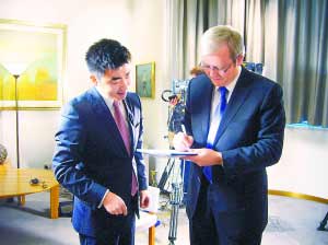 在陸克文的辦公室里中國文化元素隨處可見,陸克文特別喜歡一幅“旗開得勝”畫卷。日前,央視經(jīng)濟(jì)頻道主持人芮成鋼前往陸克文辦公室對這位“中國通”進(jìn)行了專訪。問答摘編如下。