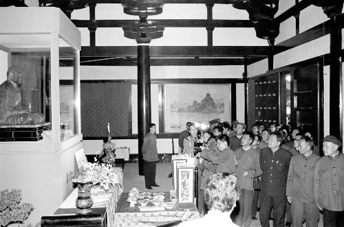 建于公元1688年的御影堂內,供奉著鑒真乾漆夾造的坐像,高2尺7寸,面向西方,雙手拱合,結跏跌坐,團目含笑,兩唇緊斂,表現鑒真于公元763年圓寂時的姿態(tài),已被定為日本國寶,每年只開放3天供人瞻仰。日本著名畫家東山魁夷為御影堂繪制的68幅屏障壁畫,有《云影》、《濤聲》、《黃山曉云》、《揚州薰風》、《桂林月宵》和《瑞光》等。