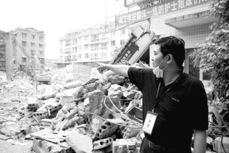 何淼告訴記者,從5月12日16時(shí),接到抗震搶險(xiǎn)指揮部下達(dá)的任務(wù)到5月17日的六個(gè)白天五個(gè)夜晚,他90%的時(shí)間都在這里。記者問(wèn)他:搜救工作進(jìn)展如何?他說(shuō):“都江堰市中醫(yī)院住院部除骨科、婦科病房沒(méi)有垮塌外,其余科室的病房全部毀損性倒塌,被埋醫(yī)護(hù)人員有32人,病員及看護(hù)家屬100多人,因?yàn)榭醋o(hù)人員沒(méi)有在冊(cè),所以傷亡的具體數(shù)字不十分準(zhǔn)確,只能估計(jì)!