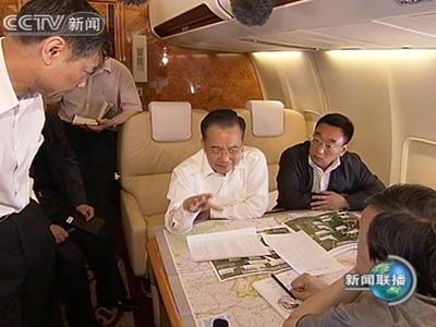 報道說,一上飛機,溫家寶就和國務委員兼國務院秘書長馬凱等總指揮部成員開始研究抗震救災工作。溫家寶說,抗震救災工作要在繼續做好搶救被困群眾的同時,把受災群眾安置和恢復重建工作擺在更加突出的位置。在安置受災群眾工作方面,目前有三項十分緊迫的任務:一是解決住的問題,二是解決衛生防疫問題,三是解決次生災害問題;謴椭亟üぷ魇紫纫M行科學周密的論證,在此基礎上做好規劃。