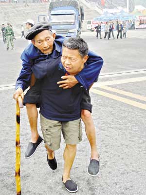 50歲的金光銀背著82歲的老父親金云才也來排隊。老人身體不好,腿腳不便,只有讓兒子背著走路。金光銀說:“政府都給我們安排好了,我們要轉移了。”