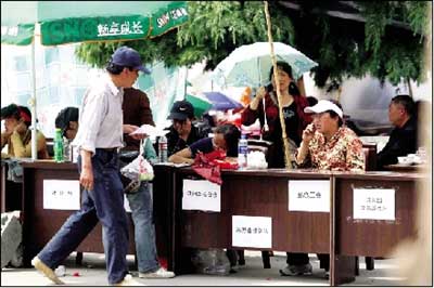 除政府部門外,法院和檢察院也在廣場(chǎng)上擺出攤子接待市民。縣法院一位女副庭長說,受地震影響,法院無法開庭審理各種案件,原本在地震后的一段時(shí)間里應(yīng)該開庭審理的案件當(dāng)事人可能會(huì)對(duì)案件無所適從。法院接待處就是為了向市民做法律方面的解釋工作。她透露,昨天縣法院要求民事、刑事及立案庭在近兩天內(nèi)開始搭建臨時(shí)法庭,并盡快恢復(fù)開庭審理案件。她說,按法律規(guī)定,遇地震等重大災(zāi)害,法院可以中止審理各種案件,但截至目前,該院沒有一起案件被中止。法院已開始清理所有積案,遇有當(dāng)事人在外地?zé)o法返回茂縣,或因重建家園而無法參加庭審的情況,法院將與其取得聯(lián)系,辦理延期開庭手續(xù)。
