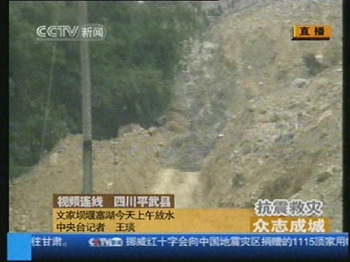 中央電視臺直播的畫面顯示,文家壩堰塞湖壩頂開啟泄流槽后,水流裹挾著泥石,緩慢泄下。
