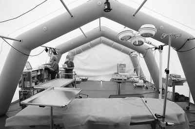 醫(yī)院設(shè)立了門診、內(nèi)科、外科、婦科、兒科和藥房,還有放射科、檢驗科、病房以及重癥監(jiān)護室,可謂“麻雀雖小,五臟俱全”。我們來到作為手術(shù)室的帳篷前,這頂帳篷不僅大而且顯得安全、結(jié)實,帳篷用充氣管支撐起來,里面有散熱的空調(diào)設(shè)備。據(jù)介紹,野戰(zhàn)醫(yī)院每頂帳篷都由天然材料制成,防火、無污染,還有真空隔熱層。配備的制氧機可直接將空氣變成氧氣,并可以調(diào)節(jié)氧氣濃度,從而代替了笨重的氧氣瓶。帳篷里面,整齊的擺放著手術(shù)服和拖鞋,一個洗手池已經(jīng)固定好。27日,這里就做了一臺簡單的手術(shù)。