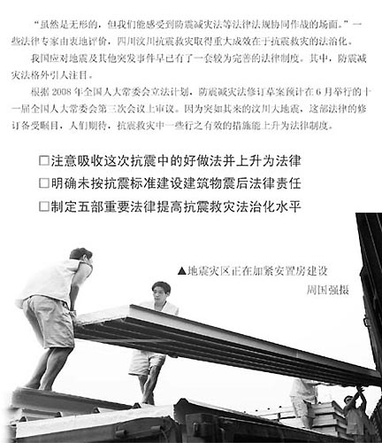 莫紀宏告訴記者,突發事件應對法實際上來源于防震減災法,一些應急預案也是根據防震減災法制定的!耙虼,在汶川地震中,發揮最大作用的恐怕還是防震減災法及其4個附屬法規。”