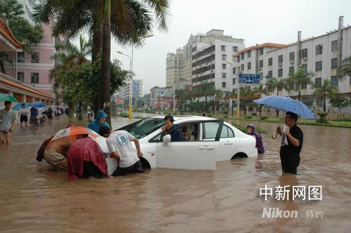 受高空槽和切變線共同影響,六月五日至六日,廣東茂名各地出現(xiàn)明顯強(qiáng)降水過程,全市日降雨量均值八十五毫米。由于降雨量大且強(qiáng),致使茂名市局部地區(qū)出現(xiàn)洪澇和山體滑坡災(zāi)害,并導(dǎo)致高州古丁鎮(zhèn)一名九歲男學(xué)生及一名十四歲女學(xué)生失蹤。據(jù)統(tǒng)計,這次暴雨成災(zāi),茂名全市有六個縣區(qū)八十一個鎮(zhèn)約六十萬人受災(zāi),倒塌房屋近千間,直接經(jīng)濟(jì)總損失二億元人民幣。圖為茂名市區(qū)幾成澤國。 中新社發(fā) 梁盛 攝