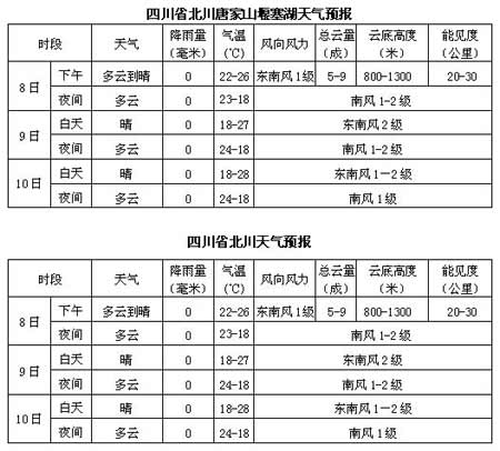 天氣預報:預計8至13日,地震災區主要以多云或晴為主,有時有小陣雨,氣溫較高,濕度較大,其中,四川成都、綿陽、德陽、廣元以及甘肅文縣、陜西略陽、寧強等地日最高氣溫可達27~32℃,帳篷內溫度34~40 ℃,四川汶川、茂縣、理縣日最高氣溫可達24~27℃,帳篷內溫度28~33℃。注意采取防暑降溫措施。