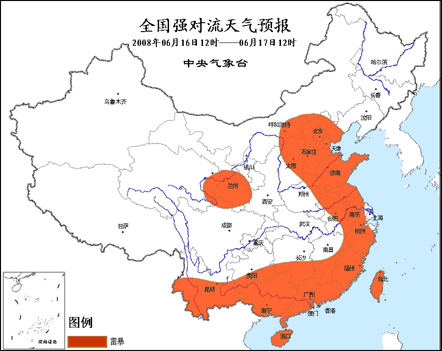 預計今天中午到明天中午,甘肅南部、華北大部、黃淮大部、江淮中東部、江南東部和南部以及貴州南部、云南中南部、華南大部、臺灣等地將有雷電天氣,上述局部地區并有短時雷雨大風或冰雹等強對流天氣。