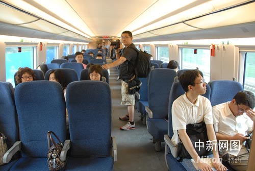 京津城際列車于北京新南站始發,列車呈全封閉狀態,里面的空間舒適而潔凈,廣播里播放著背景音樂,空調十分涼爽宜人,藍色軟席座椅前后排距離約有五十公分,扶手上有調節座椅高度的按鈕,座椅背后有小桌板和網兜。