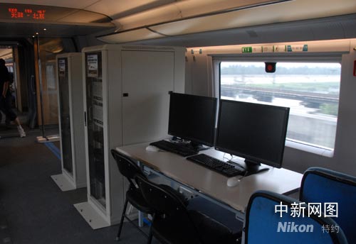 車廂里還有不少人性化設計,如懸掛在窗戶邊的應急錘、座椅上的把手、殘疾人通道、殘疾人專用洗手間、用來放置大件行李的空間、嬰兒座椅、一人高的試衣鏡等,還有“兒童一點一米線”等不少提示標牌。此外,列車上還設有酒吧,提供寬帶上網等,最大程度滿足旅客需要。