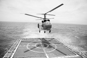 獵鷹嘯?眨瑵撆灤┍毯。驅護艦編隊、潛艇、反潛直升機在盛夏的海面上攪起陣陣練兵熱潮。從早上6時到下午4時半,直升機攻擊、單艦與直升機協同反潛、編隊與直升機協同反潛等課目輪番上陣,實現了偵察監視、信息傳輸、精確打擊一體化的聯合反潛行動。 (孫陽 汪魯迅 王朝武)