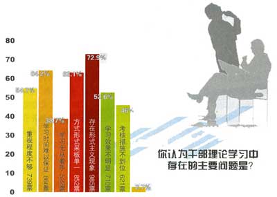 “就你的感覺,干部對理論學習的總體態度如何?”問卷調查結果顯示,72.6%的受調查者表示“只是政治任務,應付而已,談不上興趣”或“形式主義嚴重,可有可無”!澳阏J為干部理論學習中存在的主要問題是什么?”排在第一位的是“存在形式主義現象”占受調查者的72.9%。