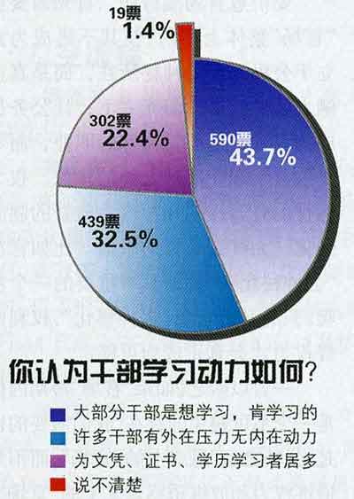 在學習中的形式主義,受調查者詬病較多。“一些干部學習違背要精要管用的原則,布置學習任務不從實際出發,組織考試弄虛作假!薄皩W習政治理論,學而不信,學而不用,空對空,走過場。為考試、為文憑、為升遷,學習目的就不端正。”等等。中國延安干部學院第5期省區市地廳級領導干部專題研究班學員表示。