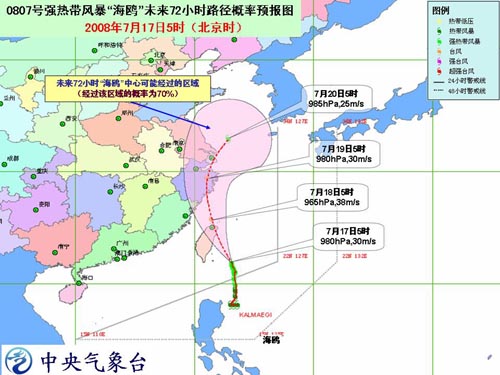 預(yù)計(jì),強(qiáng)風(fēng)暴中心將以每小時(shí)20公里左右的速度向西北偏北方向移動(dòng),逐漸向臺(tái)灣東部海面靠近,強(qiáng)度還將繼續(xù)加強(qiáng),并可能于今天夜間到明天上午在臺(tái)灣花蓮到宜蘭一帶沿海登陸,或擦過臺(tái)灣東北 部向浙閩沿海靠近。