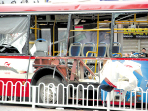 記者看到,公共汽車車體的一側(cè),在駕駛員后的位置,爆炸造成一個1.5米左右的裂口,部分座位變形,車體后部則完好無損,但車窗玻璃已全部爆碎,車體車窗玻璃及膠條最遠(yuǎn)的飛出了10多米,附近全是玻璃碎片,數(shù)十名警察拉起了警戒線。