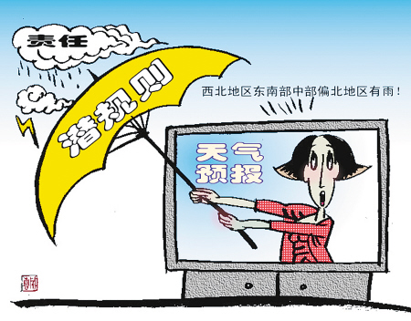 天氣預報曾被批為“四大不準”之首,原來氣象專家們學會了“太極拳”,啟用了“潛規則”,以一串模糊不清的詞語,讓百姓不知所云,自己無責一身輕了!這層窗戶紙被“業內人士”捅破后,長期被忽悠、愚弄的觀眾忍不住發問:每天黃金時間播報,那么多經費供養,竟然貢獻出這樣的東東,這節目、這專家、這部門還要它干什么?的確,天氣預報不準確,百姓會很有意見,但即使報錯了,氣象部門也沒有哪個受到撤職或處分。民憤起于一時,但很快會歸為理性,作為“氣象人”,何必自作聰明用模糊語言忽悠民眾、罔顧己責呢?
