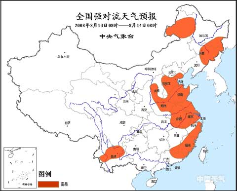 中新網(wǎng)8月13日電 據(jù)中國天氣網(wǎng)消息,中央氣象臺今晨六時繼續(xù)發(fā)布強(qiáng)對流天氣預(yù)報: