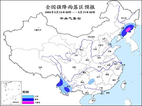 預計今天白天到夜間,黑龍江東南部、遼寧中東部、吉林東北部、湖南西南部、廣西西北部、云南中西部等地的部分地區有大雨或暴雨,其中吉林東部的局部地區有大暴雨。