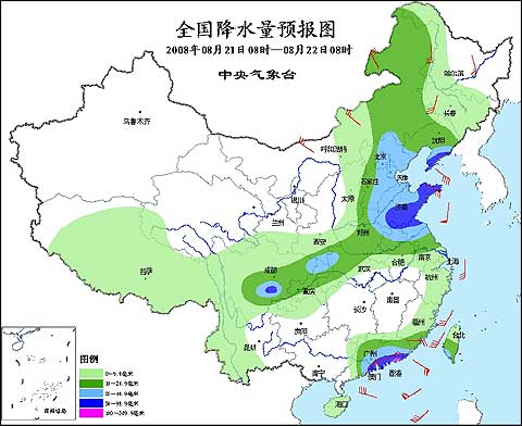 2008年8月21日8時(shí)—8月22日8時(shí)全國(guó)降水量預(yù)報(bào)圖