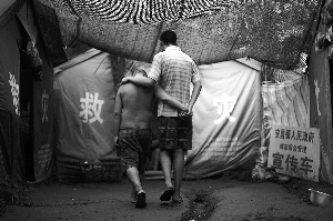 劉軍是北川縣曲山鎮(zhèn)人,地震奪去了他妻子的生命,家財(cái)盡毀。現(xiàn)在劉軍已出院,在北川擂鼓鎮(zhèn)的災(zāi)民安置點(diǎn)四處游蕩。周圍的災(zāi)民說,他時(shí)常沉默不語,四處扒土。