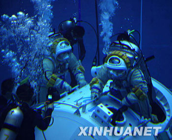 6月12日,中國載人航天工程辦公室新聞發言人宣布,神舟七號載人航天飛行任務將于2008年10月擇機實施。這是航天員著艙外航天服在水槽進行模擬失重訓練和出艙活動任務訓練。 新華社發 秦憲安攝