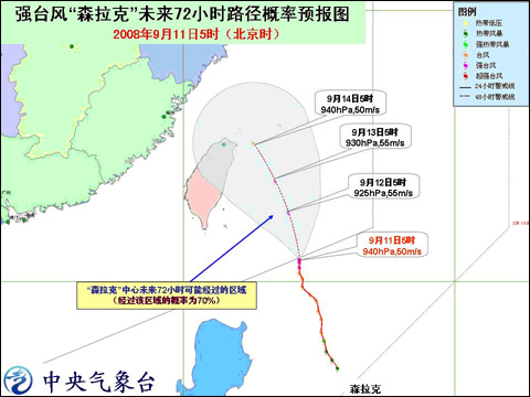 圖為今天早上7點的森拉克衛星云圖。可以看出,目前“森拉克”的外圍云系已經影響到我國臺灣省東部地區。