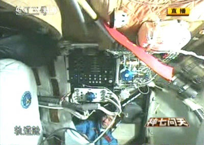 劉伯明在飛船軌道艙進行軌道艙狀態檢查和艙外航天服的組裝與測試等工作。(電視截圖)