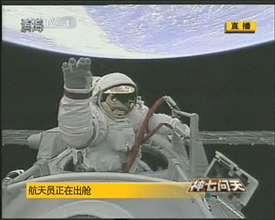 中新網(wǎng)9月27日電 中國“神七”載人飛船航天員翟志剛今天下午16時(shí)43分左右順利出艙,實(shí)施中國首次空間出艙活動(dòng)。他半個(gè)身子先探出去,首先對著軌道艙外的攝像頭揮手“打招呼”。