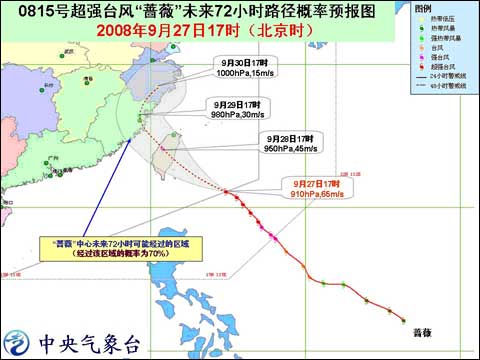 中新網9月27日電 據中國天氣網消息,中央氣象臺2008年9月27日18時發布臺風紅色警報稱:預計,今年第15號超強臺風“薔薇”將以每小時20-25公里的速度向西北方向移動,逐漸向臺灣東部一帶沿?拷,將于明天中午到夜間在臺灣宜蘭到臺東一帶沿海登陸。