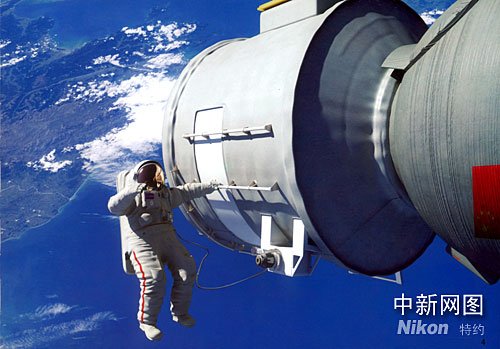23時36分許:翟志剛著中國自主研發的“飛天”艙外航天服在太空首次亮相。