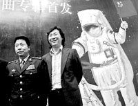 發布會上首次公布了隨“神七”飛船飛天的100多首歌曲,其中包括全新創作的15首航天歌曲專輯。楊利偉表示,“我深愛《我為祖國感到驕傲》這首歌,每一次聽到都會感到心情激動。那就是我們航天員回到地球打開艙門時最想說的第一句話,是我們的真情感受。”本臺晚會的音樂總監、蒙族音樂家恩克巴雅爾也是 《我為祖國感到驕傲》的曲作者,他介紹說:“這一百多首歌曲有郭蘭英演唱的《我的祖國》、宋祖英演唱的《望月》以及成龍演唱的《男兒當自強》等。”(記者 李澄/文 鄒紅/攝)