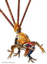 “胡氏耀龍”生活在侏羅紀(jì)時期,身體全長超過40厘米,屬于鳥翼類,代表了和鳥類關(guān)系最為接近的恐龍之一。不同于其他已知恐龍,“胡氏耀龍”長有4枚長約20多厘米的帶狀尾羽。更有意思的是,它的其他羽毛均未形成為類似鳥類飛羽的構(gòu)造,雖然“胡氏耀龍”的前肢長于后肢,形成了類似原始鳥類的前肢,但由于沒有飛羽,“胡氏耀龍”并不具有飛行能力。