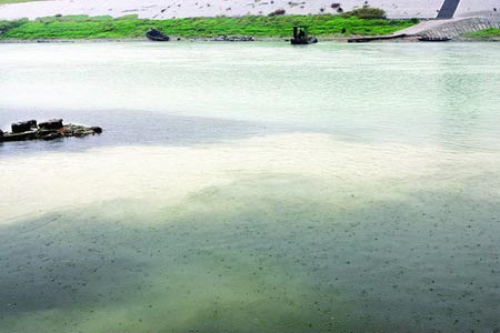 昨日上午11時,記者可以清晰地看到河水的顏色分成好幾個層次,約五十米寬的河面上,最靠近岸邊的是黑色,再過去一點的是鮮明的乳白色,越往河心顏色越濃,整個河面呈現出白得發青的顏色,排水口還在不停地往河里排放乳白色、漂著白色泡沫的污水,早上的大雨也絲毫沒能沖散掉乳白色的河水。