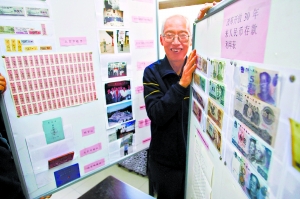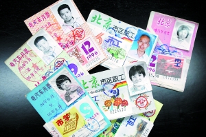 從2元的1995年版公交月票,到30元的2004年版公交月票,糧票、油票、工資條、彩票、選民證等,柯富海老人的100多件收藏品,在西花市大街南里居委會(huì)林林總總擺滿了三面墻。這是一位花甲老人的“個(gè)人改革開放30周年展”。