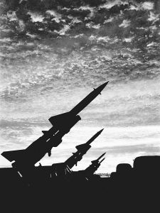 突然,霹靂震天,地平線上猛地躥起一條條“火龍”,拖著銀白的煙柱直刺蒼穹。轉眼,“火龍”變作一顆顆熾熱的流星,怒吼著、呼嘯著,把一架架行蹤詭秘的“敵”機打得粉身碎骨……