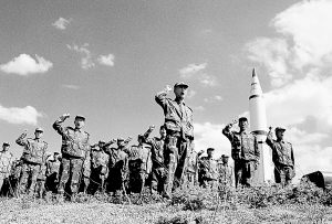 今朝長纓在手,敢縛出海蛟龍。1996年3月,在我國東南沿海舉行的那場規模宏大的軍事演習中,一枚枚威武挺拔的新型導彈,在群山環抱中起豎聳立!包c火!”隨著命令傳出,驚雷搖撼大地,閃電劃破長空,一枚枚導彈呼嘯著飛向預定目標……顯示了中國人民捍衛國家主權和領土完整的堅強決心,展示了第二炮兵的軍事打擊能力。