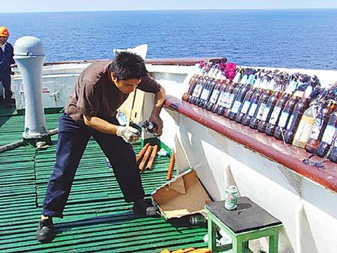 這時我們的船員都退到了生活區,因為主甲板到駕駛樓下生活區有6米高的落差,兩者中間的兩架鐵梯已經事先被割斷了,我們也將生活區的門封住了,海盜進不來。我在駕駛樓里通知所有的船員說,一定不要暴露自己的身體,然后大家將艙里的幾百個啤酒瓶裝上了油漆水,點著了,拼命朝甲板上扔,海盜哇哇大叫。