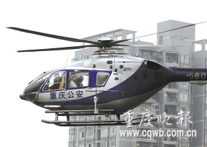 直升機從市公安局停機坪出發,載著三名醫護人員趕赴城口進行救援。記者 吳子敬 攝