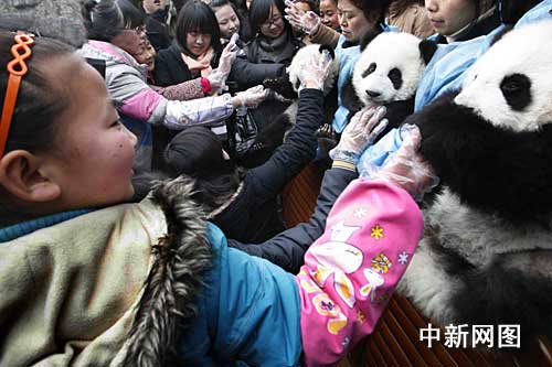 當工作人員抱著只有半歲大的三只大熊貓寶寶走出熊貓太陽產房時,孩子們都戴上了專用的塑料手套,爭先恐后上前撫摸熊貓寶寶。說起第一次親密接觸的感受,孩子們打了一個很形象的比喻:“摸上去就像摸柔軟的羽絨服一樣,很舒服。”