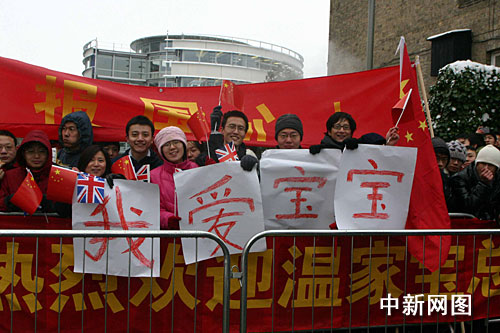 中新網(wǎng)倫敦2月2日電(記者 張朔)當(dāng)?shù)貢r(shí)間二月二日下午,即將結(jié)束訪英和訪歐行程的中國(guó)總理溫家寶踏雪到訪劍橋大學(xué),受到學(xué)子們的熱烈歡迎。有的學(xué)生甚至還打出了中文標(biāo)語(yǔ):“我愛寶寶。”