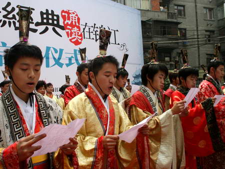 “龍之傳人,天命東方。列祖賜我光榮,蒼天降我大貴。弱冠既加,如之棟梁。道義不辭,大任始承……”3月26日,十八名身穿漢服的成都青年當眾完成漢代成人禮,而錦江區國學經典誦讀活動亦隨即啟動。四川新聞網記者獲悉,為倡導轄區內機關干部爭讀國學,錦江區公開發出倡議,號召全區機關干部每天關閉電視或電腦一小時,把時間用于學習國學經典。