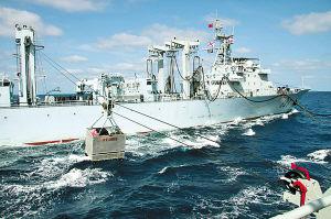 經過9天9夜的航行,今天(注:11日)上午,海軍第二批護航編隊的“深圳”號導彈驅逐艦和“黃山”號導彈護衛艦,在阿拉伯海與前出接應的第一批護航編隊的“微山湖”號綜合補給艦會合,并實施了補給。