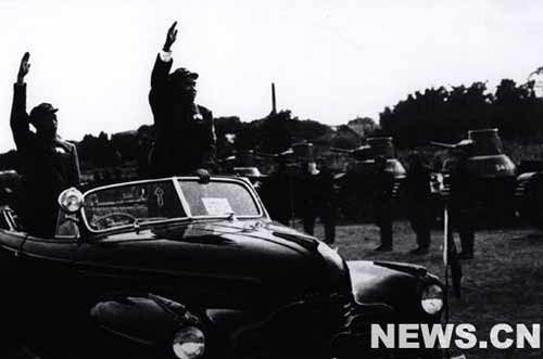 這次閱兵活動是中國人民獲得解放后第一次軍事盛典。1949年10月1日,毛澤東主席在天安門城樓上莊嚴宣布:“中華人民共和國中央人民政府已于本日成立了。”并親自升起第一面五星紅旗。閱兵司令員朱德總司令在閱兵總指揮聶榮臻陪同下,檢閱了受閱部隊,并發(fā)布了《中國人民解放軍總部命令》。隨后,聶榮臻率領(lǐng)陸、海、空三軍受閱部隊的分列式由東至西從天安門城樓前通過。首先通過天安門廣場的是年輕的人民海軍,隨后跟進的是步兵、炮兵、摩托化步兵、裝甲步兵、坦克兵和騎兵師。在步兵行進的同時,年輕的人民空軍各型戰(zhàn)機飛臨天安門上空接受黨和國家領(lǐng)導(dǎo)人及各界人民代表的檢閱。