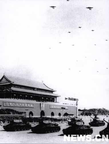 閱兵式開始。中國(guó)人民解放軍朱德總司令乘車閱兵。閱兵后,朱德總司令登臨檢閱臺(tái)宣讀《中國(guó)人民解放軍總部給全國(guó)武裝部隊(duì)的命令》,接著進(jìn)行武裝部隊(duì)的分列式。