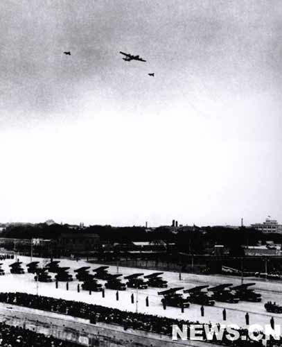 當地面部隊經過廣場時,在天空出現了英勇的鐵鷹,兩架殲擊機護送著一架領航機飛在前1954面,接著重轟炸機、噴氣式轟炸機和殲擊機,一隊一隊地掠過天安門上空。