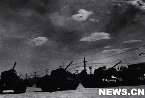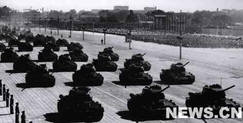 接著,受閱部隊開始分列式。軍事學院的隊伍邁開整齊的步伐首先走進天安門廣場。緊跟在他們后面的是步兵學校、炮兵學校、工程兵學校、坦克學校、航空學校、海軍學校和水兵、公安軍、步兵、摩托化步兵、傘兵的隊伍。隨后,裝備著各種大口徑遠射程大炮的炮兵部隊和威力強大的坦克部隊相繼通過了廣場。當坦克部隊在天安門廣場出現時,一隊隊噴氣式轟炸機和殲擊機風馳電掣地飛過天安門上空。