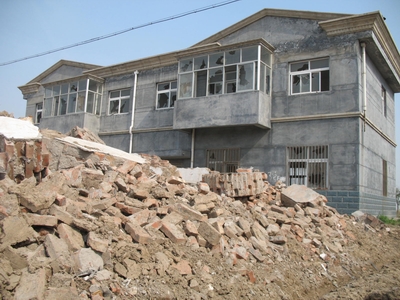 在現場,記者看到,在迎賓大道路東第一棟別墅后面,一排平房已被拆成廢墟。據房主李某介紹,由于沒有土地證,他的房子去年就被拆除了,“但前面的別墅同樣沒有土地證,為什么完好無損?”據了解,李某房前別墅的主人是二隊書記于某。